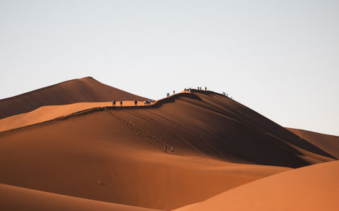 Set against the backdrop of one of the world's oldest deserts, Sossusvlei is a testament to the enduring power of nature. Millennia of wind and weather have shaped its towering red dunes, creating a mesmerizing symphony of shapes and shadows that captivates the imagination. At the heart of Sossusvlei lies Deadvlei, a surreal pan surrounded by towering dunes. Here, the skeletal remains of ancient camel thorn trees stand as silent sentinels, preserved for centuries in the arid desert air. Once part of a thriving forest, these trees now stand petrified, their stark silhouettes a poignant reminder of the passage of time.
